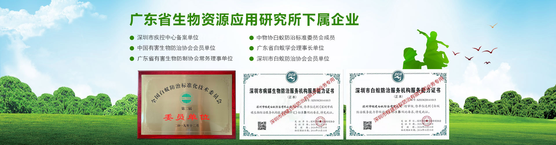 專注于徹底根治、防治結合,售后跟蹤服務,專業(yè)服務工程師有豐富實戰(zhàn)經(jīng)驗超過十年。持有專業(yè)資格證書認證:“有害生物防制服務機構服務能力證書B級”、“白蟻防治服務機構服務能力證書B級”所有員工持有“深圳市白蟻防治上崗證”和“深圳市除蟲滅鼠上崗證”,雙資格證上崗服務。榮獲過:“優(yōu)質(zhì)服務示范單位”、“白蟻防治服務信譽AAA級單位”、“深圳市白蟻防治先進單位”、“深圳市十大白蟻防治品牌”、“深圳市殺蟲公司”、“深圳市消殺公司”先進單位等榮譽。
